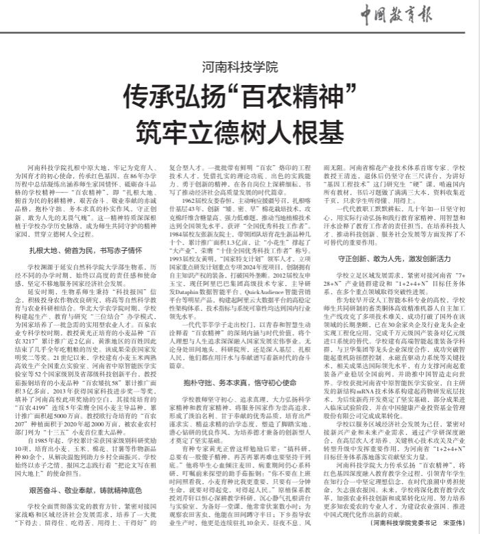 2025年11月6日的《中国教育报》第08版发表宋亚伟署名文章《传承弘扬“百农精神” 筑牢立德树人根基》。文章全文如下:
