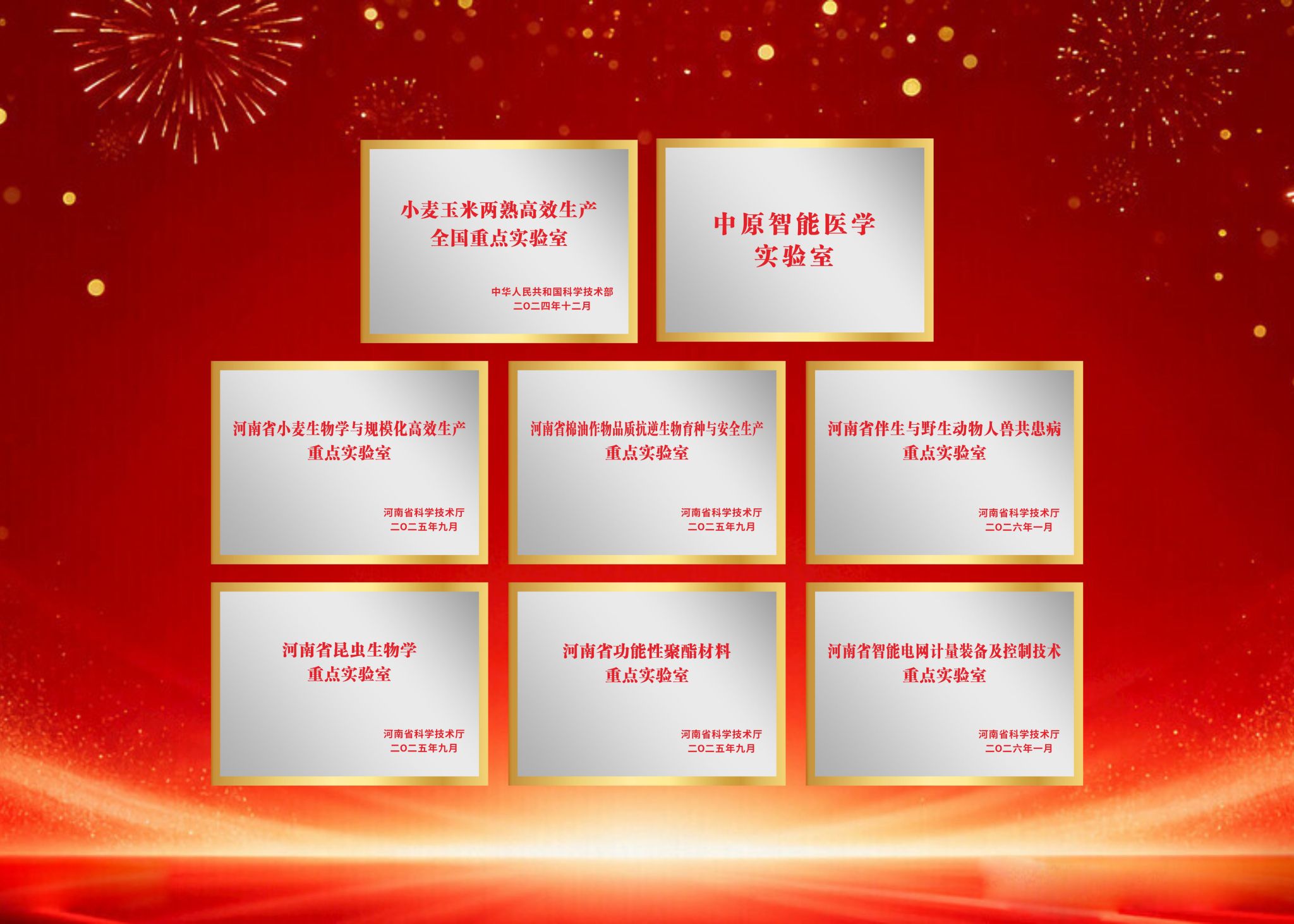 欧行奇教授荣获中共中央、国务院设立的“全国先进工作者”国家级荣誉。聂福全教授牵头的工作室入选首批省级无党派人士创新工作室,构建起国家、省、市、校四级的劳模工匠创新工作室体系。信息工程学院张卫东、园艺园林学院袁敬平2位教师获评“河南省青年五四奖(先进个人)”。学生吴娇娇获评“河南省青年五四奖(先进个人)”。毕业生韩飞荣获教育部“高校毕业生基层就业卓越奖学金”。学校首次获得“2024年度全省统战工作成绩突出单位”称号。在第十九届“挑战杯”全国大学生课外学术科技作品竞赛中,3项作品斩获“人工智能+”专项赛二、三等奖。在全国高校教师教学创新大赛中获得二等奖1项。舞狮队代表河南省出征第十五届全国运动会,勇夺舞龙舞狮项目银牌,充分展现中华优秀传统体育文化传承成果,持续擦亮“科院龙狮”品牌。系列荣誉与佳绩,彰显育人成效。